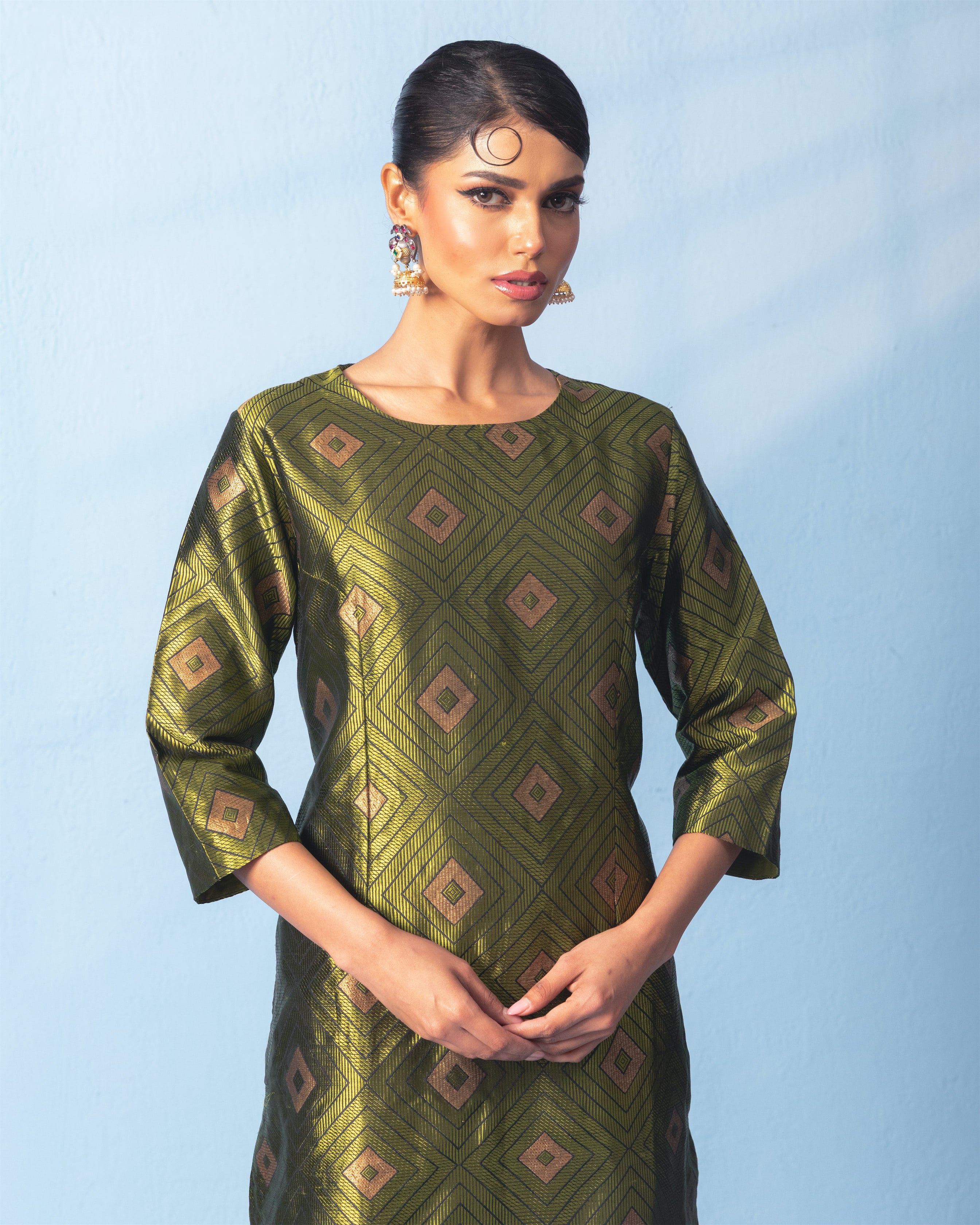 The timeless elegance of Banarasi craftsmanship meets contemporary cuts for a versatile and elevated ensemble.