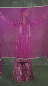 • Premium Banarasi Silk Fabric: Rich magenta-purple kurta and garara with timeless zari detailing