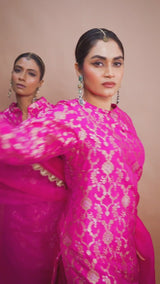 • Kurta Fabric: Banarasi silk with intricate Mughal jaal design in gold zari, accented with silver zari